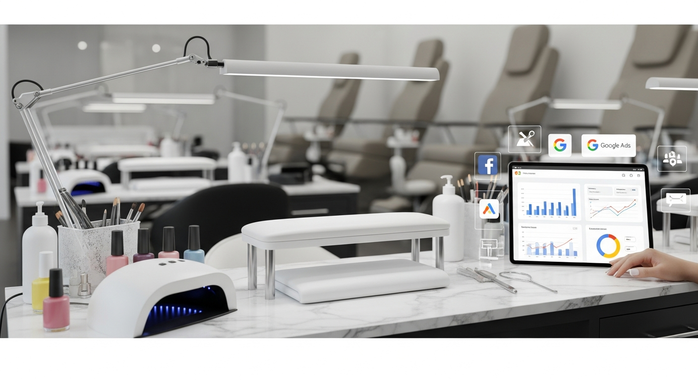 Nail salon advertising involves using paid digital channels like Facebook and Google Ads to acquire new local clients. Success depends on targeting specific geographic areas, managing daily budgets, and monitoring lead generation costs. This strategy helps salon owners increase appointment bookings by appearing where potential customers are actively searching or browsing.